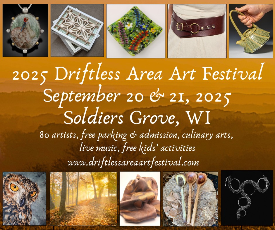 Driftless Area Art Festival will be held Sept 20 & 21, 2025 in Soldiers Grove, 10 a.m. to 5 p.m. Saturday, 10 a.m. to 4 p.m. Sunday.The FREE event features more than 80 juried artists from Southwest Wisconsin, Northeast Iowa, Southeast Minnesota and far Northwest Illinois displaying fine art in the following categories: drawing, ceramics, fiber, glass, jewelry, metalwork, mixed […]