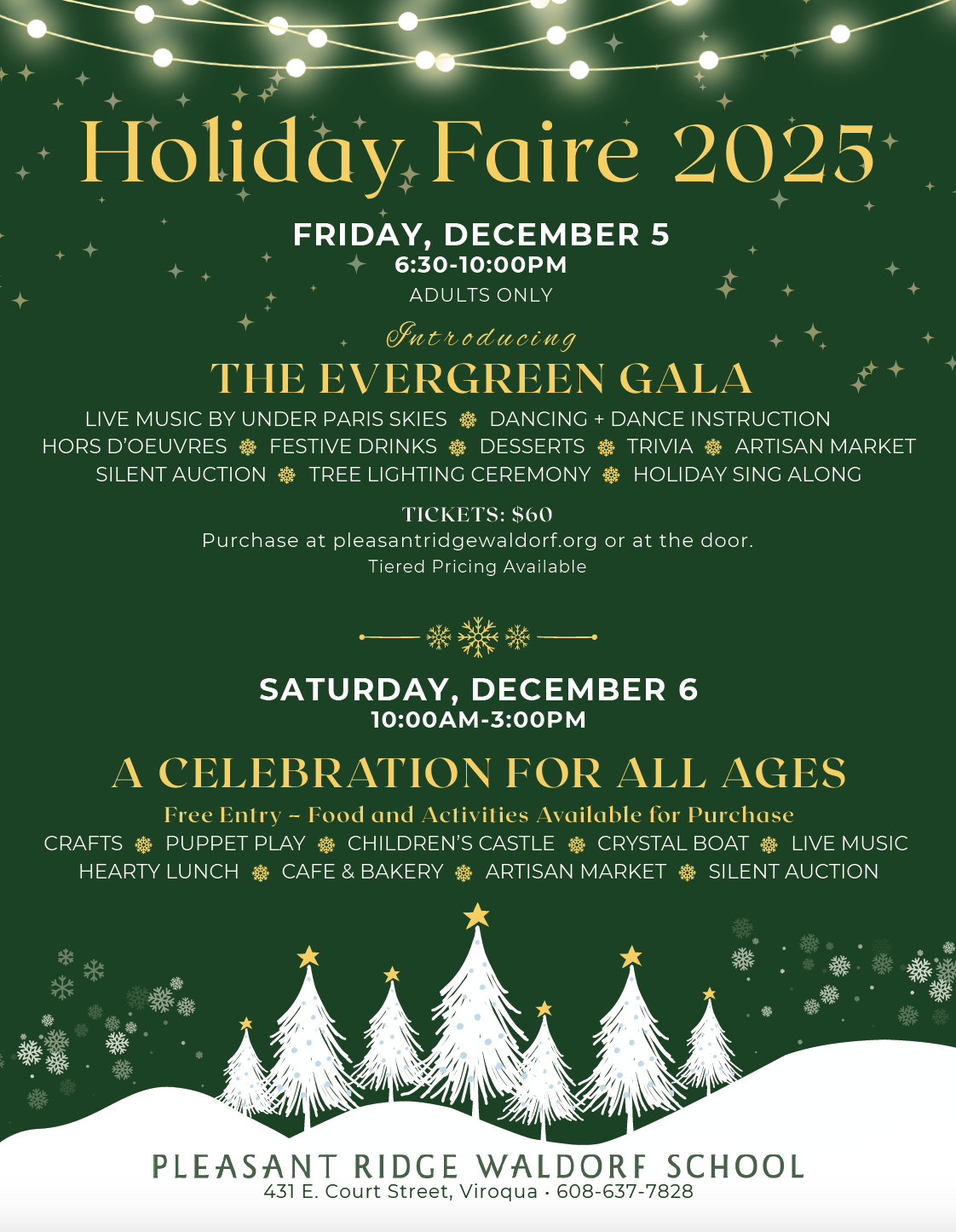 In celebration of our 45th school year, we are excited to announce the Evergreen Gala on Friday, December 5th at the Holiday Faire!Dance the night away with live music from Under Paris Skies, shop the artisan market and silent auction, sip on festive drinks from the cafe and bar, savor delicious hors d’oeuvres, enjoy the tree lighting ceremony, join the holiday […]