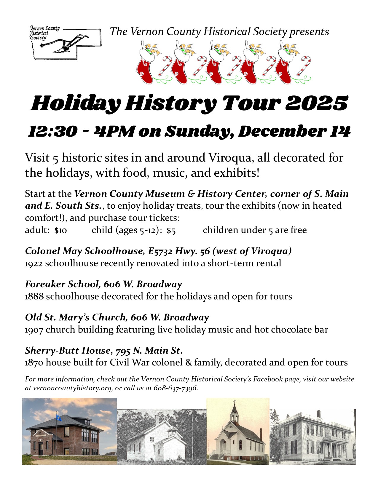 This year’s tour will feature five historic buildings in and around Viroqua. The tour will be held on Sunday, December 14, from 12:30 to 4PM. Start at the Vernon County Museum and History Center to enjoy holiday treats, tour the exhibits (now in heated comfort!), and purchase tickets. Tickets are $10 for adults and $5 for children ages 5 to […]