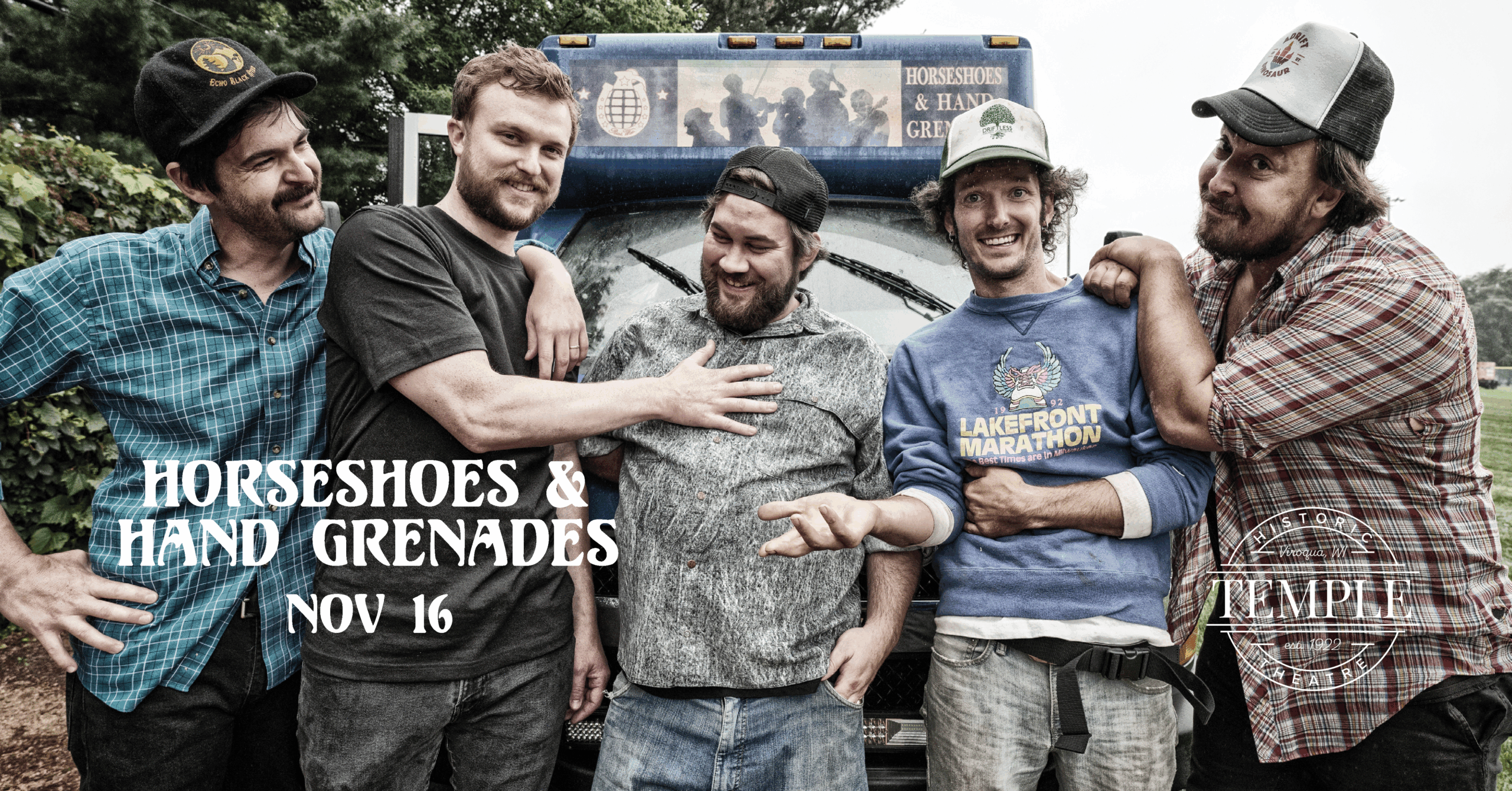 After ten years, five albums, innumerable sold out shows, and countless libations, Americana mavericks Horseshoes & Hand Grenades appropriately consider themselves a “family” on a wild, wonderful, and often whacky roller coaster. The bond between the quintet— Adam Greuel [guitar, vocals], David C. Lynch [harmonica, accordion, vocals], Collin Mettelka [fiddle, vocals], Russell Pedersen [banjo, vocals], and Samual Odin [bass, vocals]— fuels their creativity and chemistry on stage and in the studio.