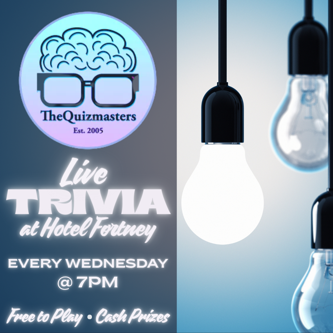 Join us for another great season of LIVE Trivia at the Hotel Fortney Lounge! We’ll play one game per night with five brain-busting rounds for you to show us just how smart you really are. FREE to play with cash prizes going to the top two teams each week. Dinner and drinks available as well!
