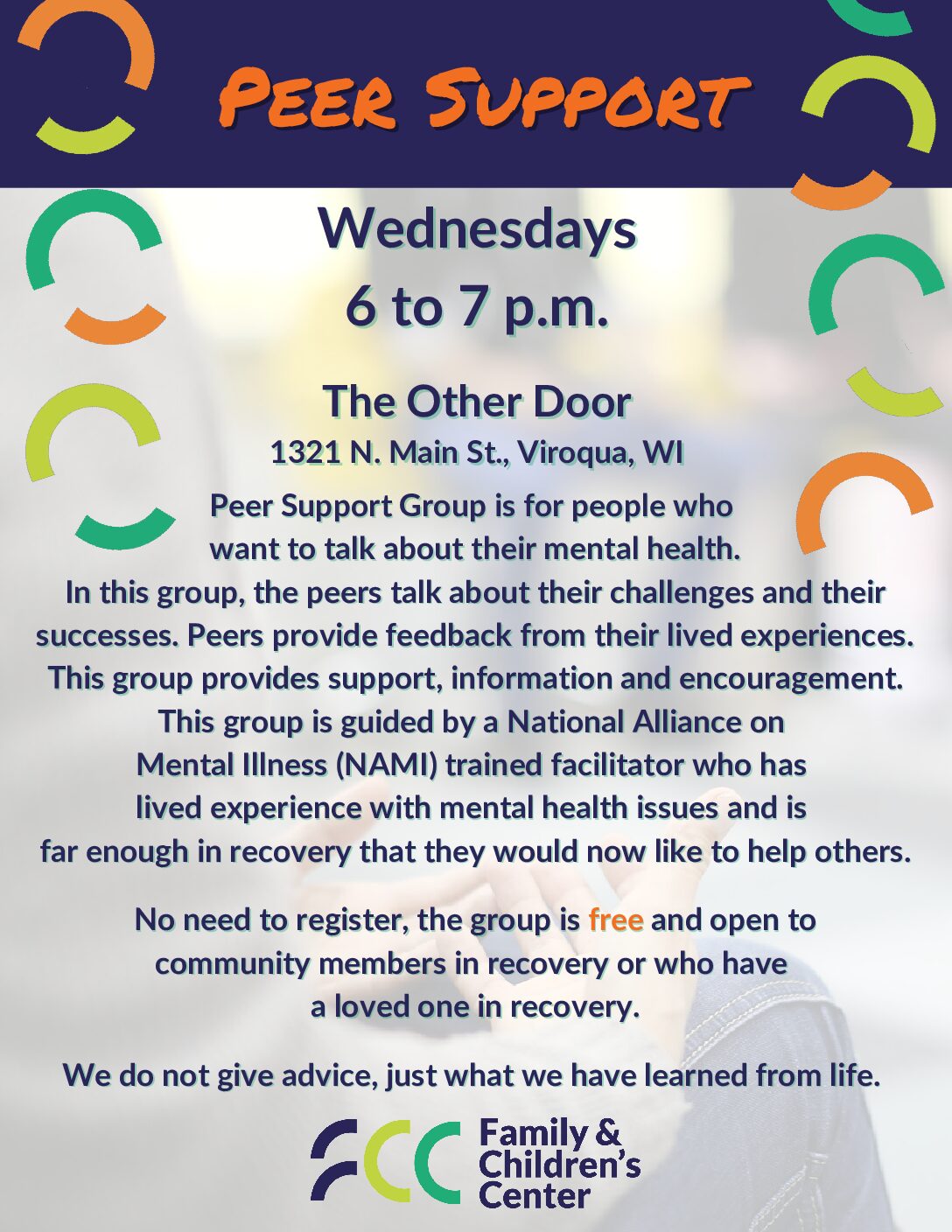 Peer Support Group is for people who want to talk about their mental health. In this group, the peers talk about their challenges and their successes. Peers provide feedback from their lived experiences.